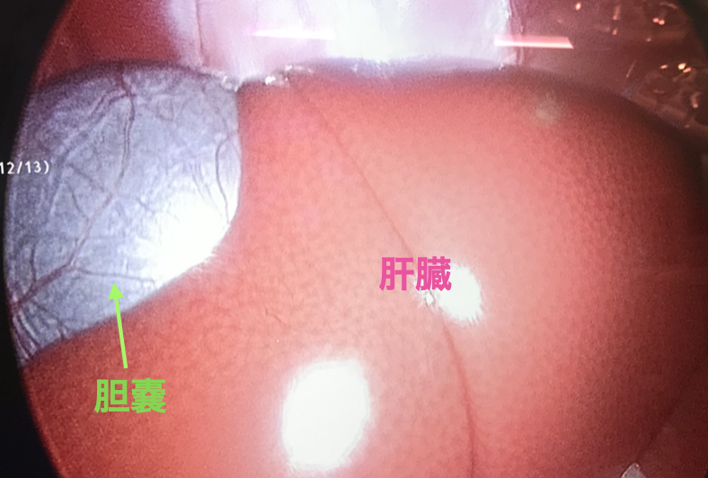 腹腔鏡で肝臓と胆嚢を観察する。肉眼上は異常に見えないが、病理検査で微小血管異常が認められた。