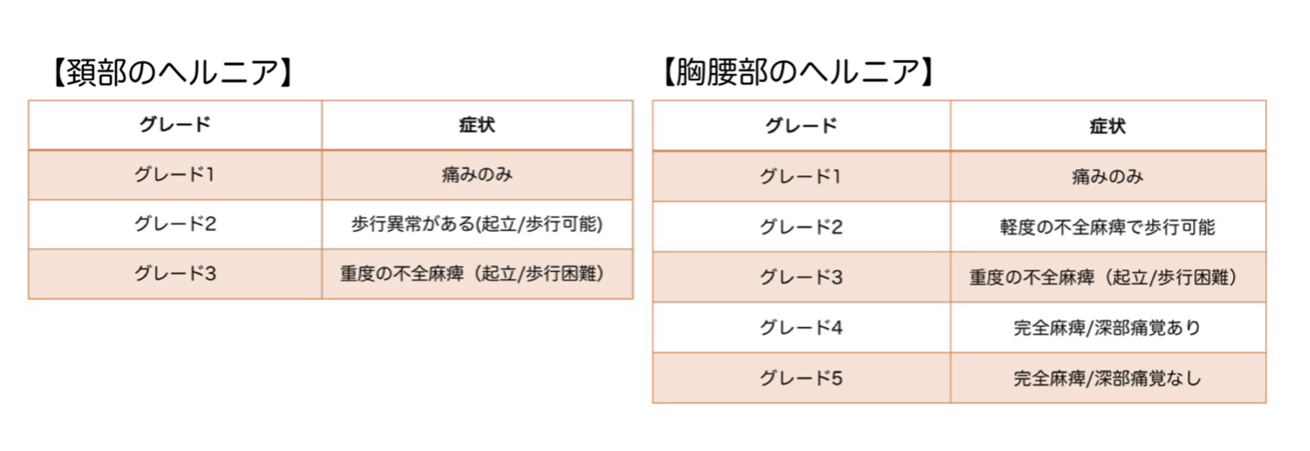 重度な場合には脊髄を圧迫している椎間板を取り除く、外科治療が推奨されます。特に上記のグレード5の場合には緊急的な精査、外科治療が必要になります。