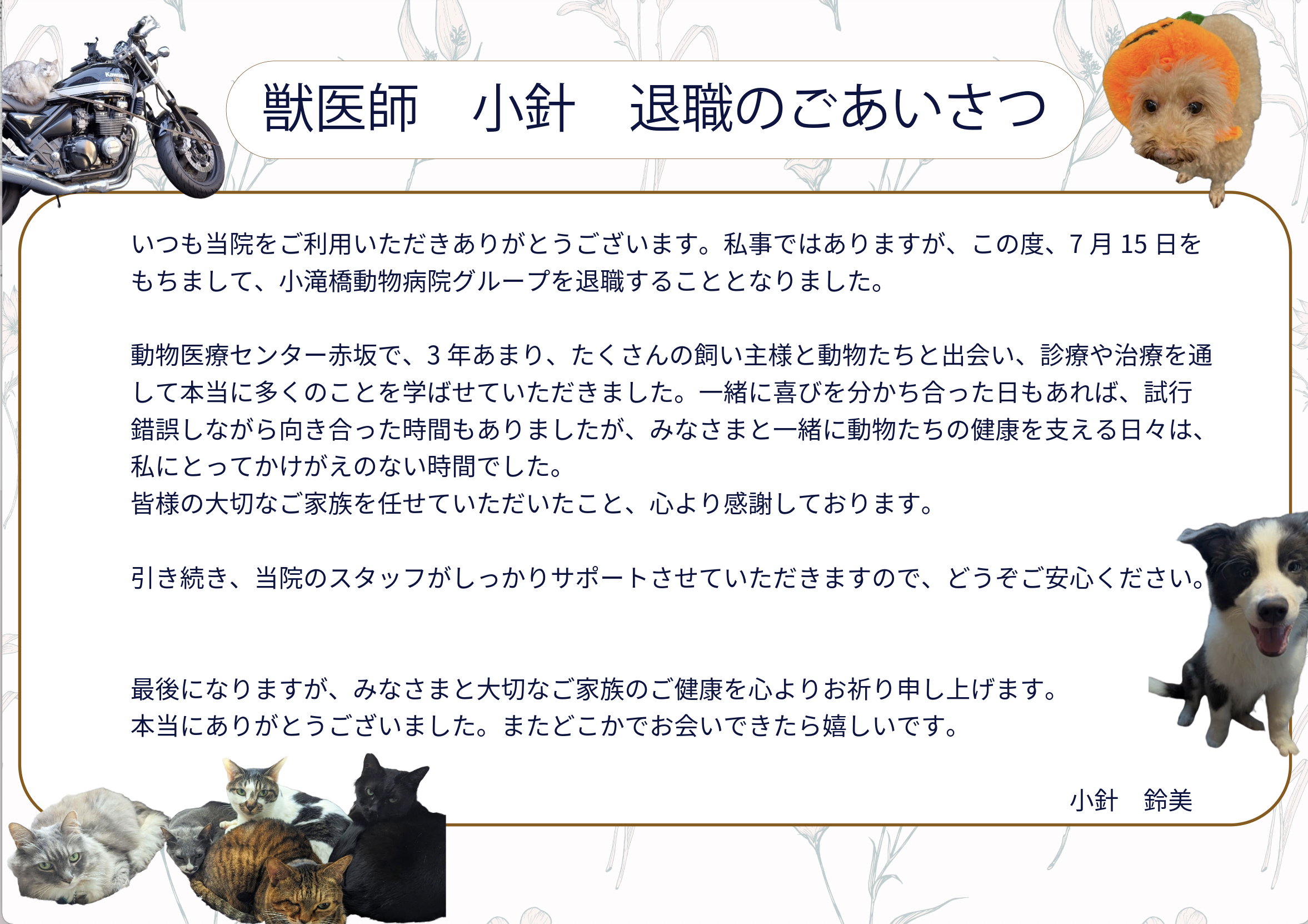 この度、当院獣医師の小針が7月15日をもちまして退職することとなりました。