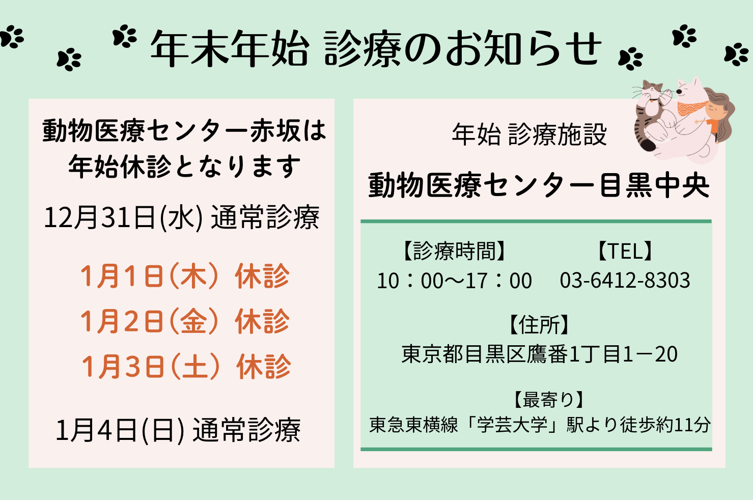 提携病院の動物医療センター目黒中央は三が日も診察を行っております。(*緊急対応のみ)