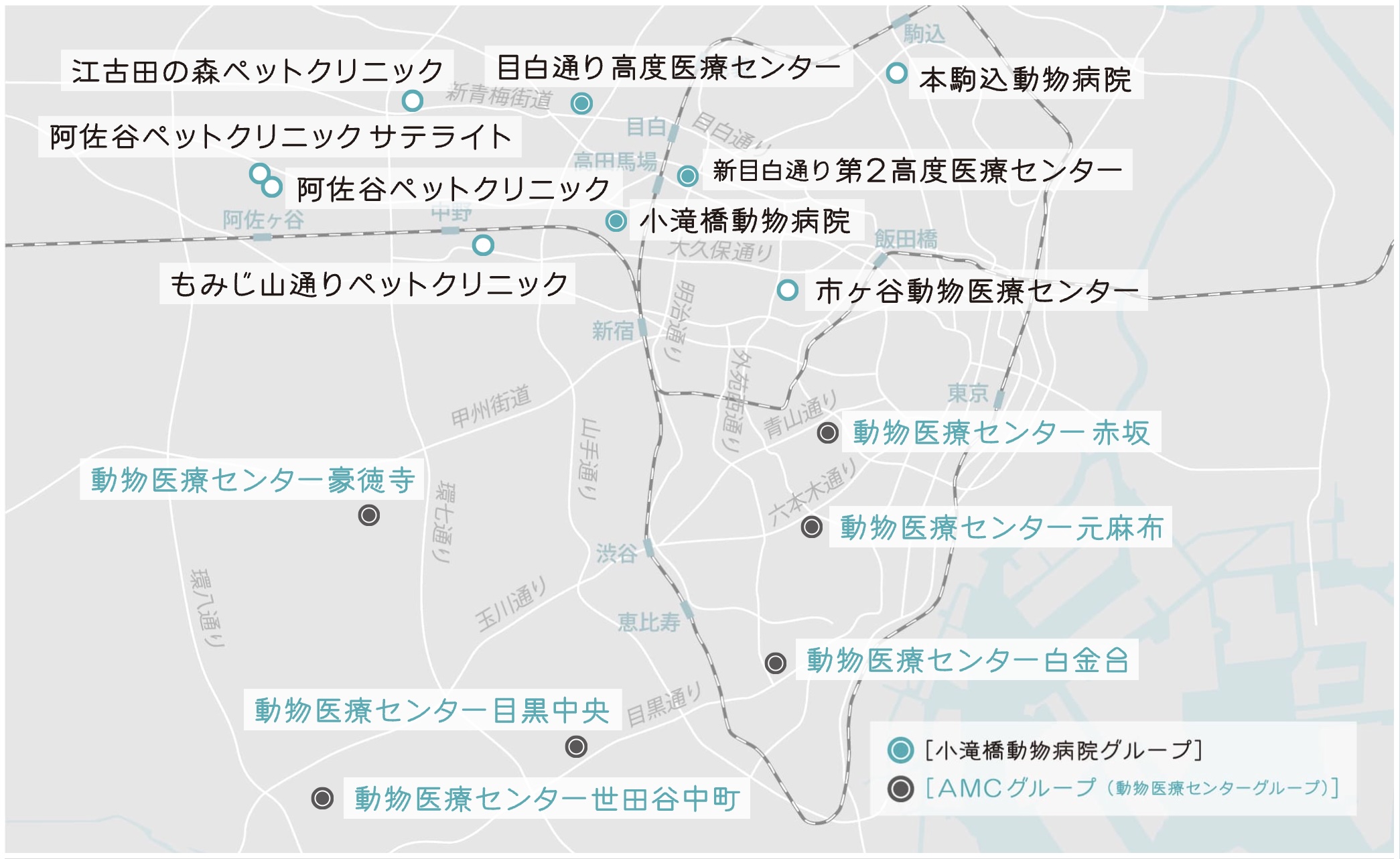 動物医療センターグループ(AMCグループ)は、都内で高度医療センター2施設を含む7施設を展開する『小滝橋動物病院グループ』で経験を積んだ獣医師が診察に立ち、予防医療から高度医療、そして高いホスピタリティを提供できる、都心にこそ存在すべき動物病院を目指しています。