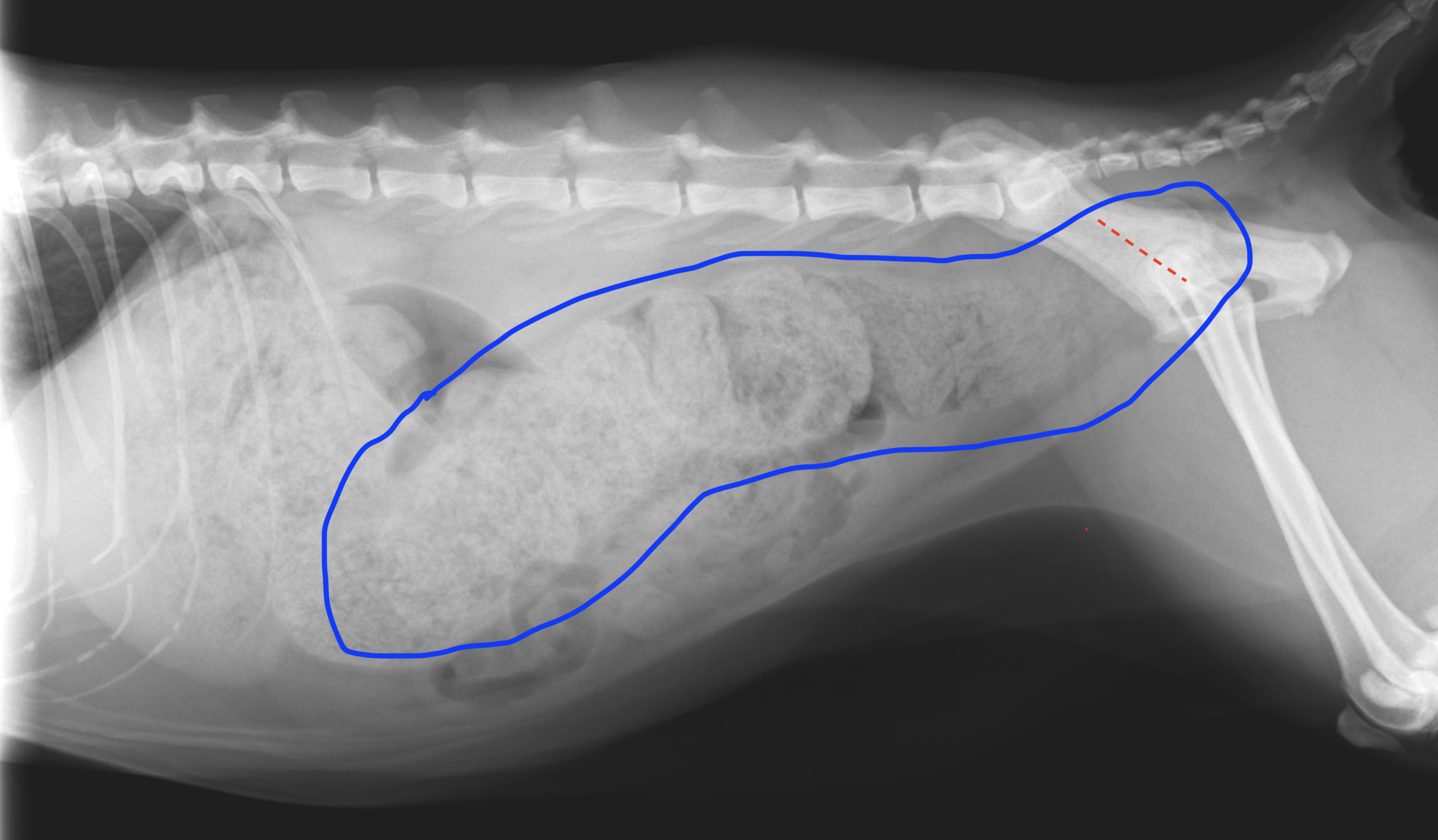 重度便秘の猫のレントゲン写真です。左側が頭方向で撮影しています。青線で囲まれた白い部分が結腸に溜まった便です。白が濃い程硬く出づらい便の可能性が高く、赤点線の骨盤の狭い部分が通れなくなっています。