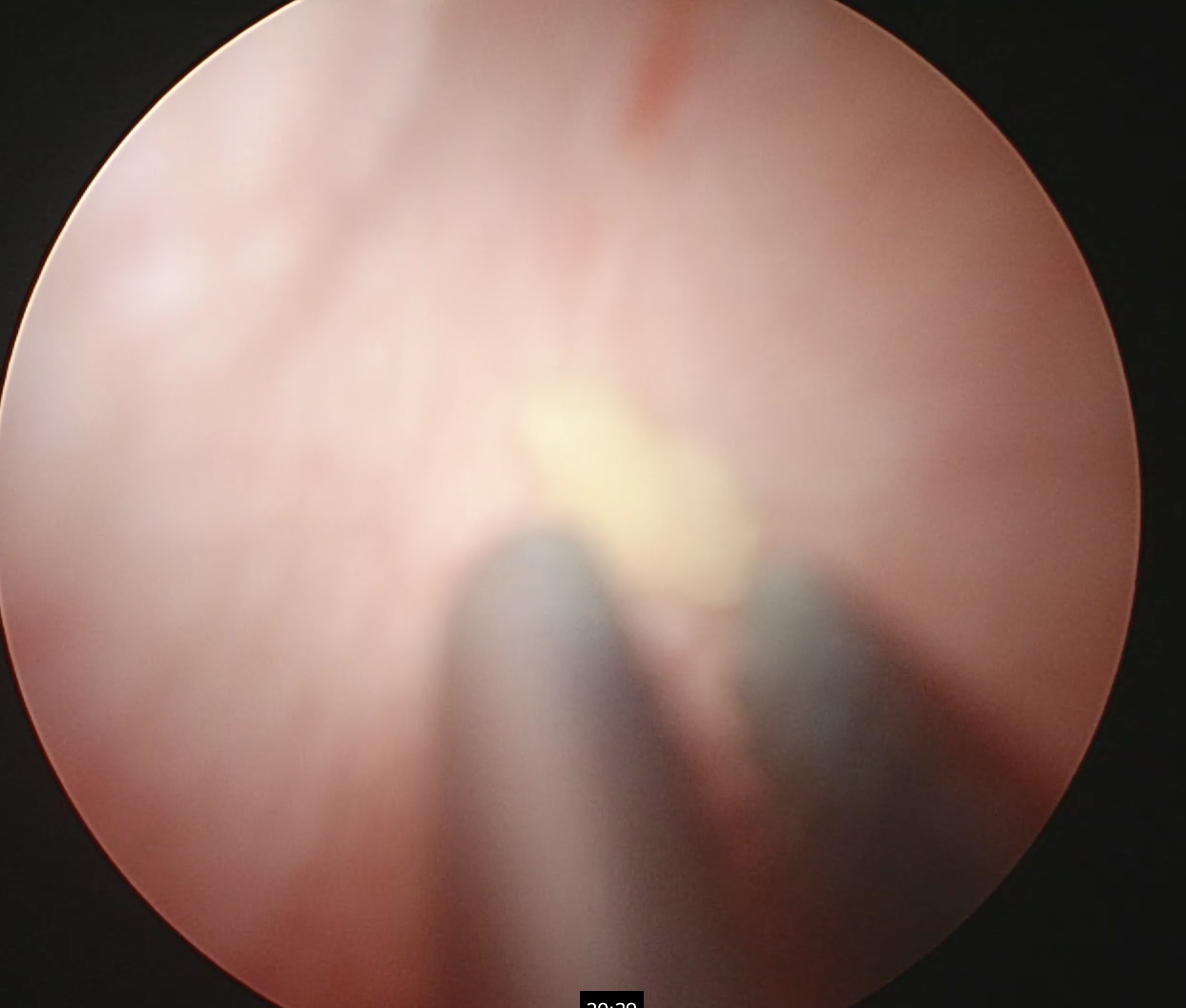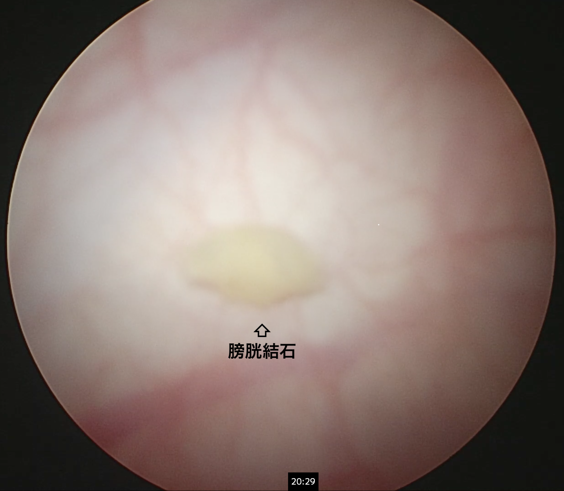 矢印は腹腔鏡カメラ越しに見た膀胱結石です。