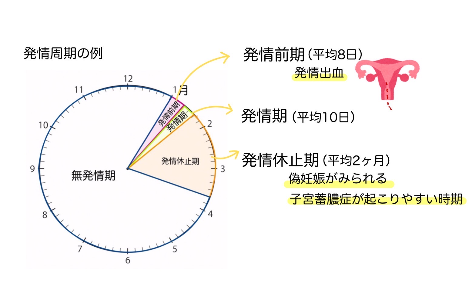 犬は発情前期に生理(発情出血)が起きてから発情期を迎え、発情休止期に至ります。