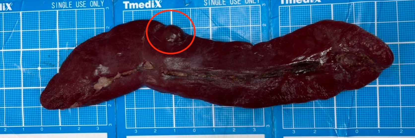 今回下痢と嘔吐を主訴に来院された際の腹部超音波検査にて偶発的に脾臓に腫瘤が認めらました。腫瘤自体は1.2cm大と比較的まだ小型でしたが、一般状態も良好な為早期のCT画像検査での全身の精査及び脾臓摘出を実施しました。