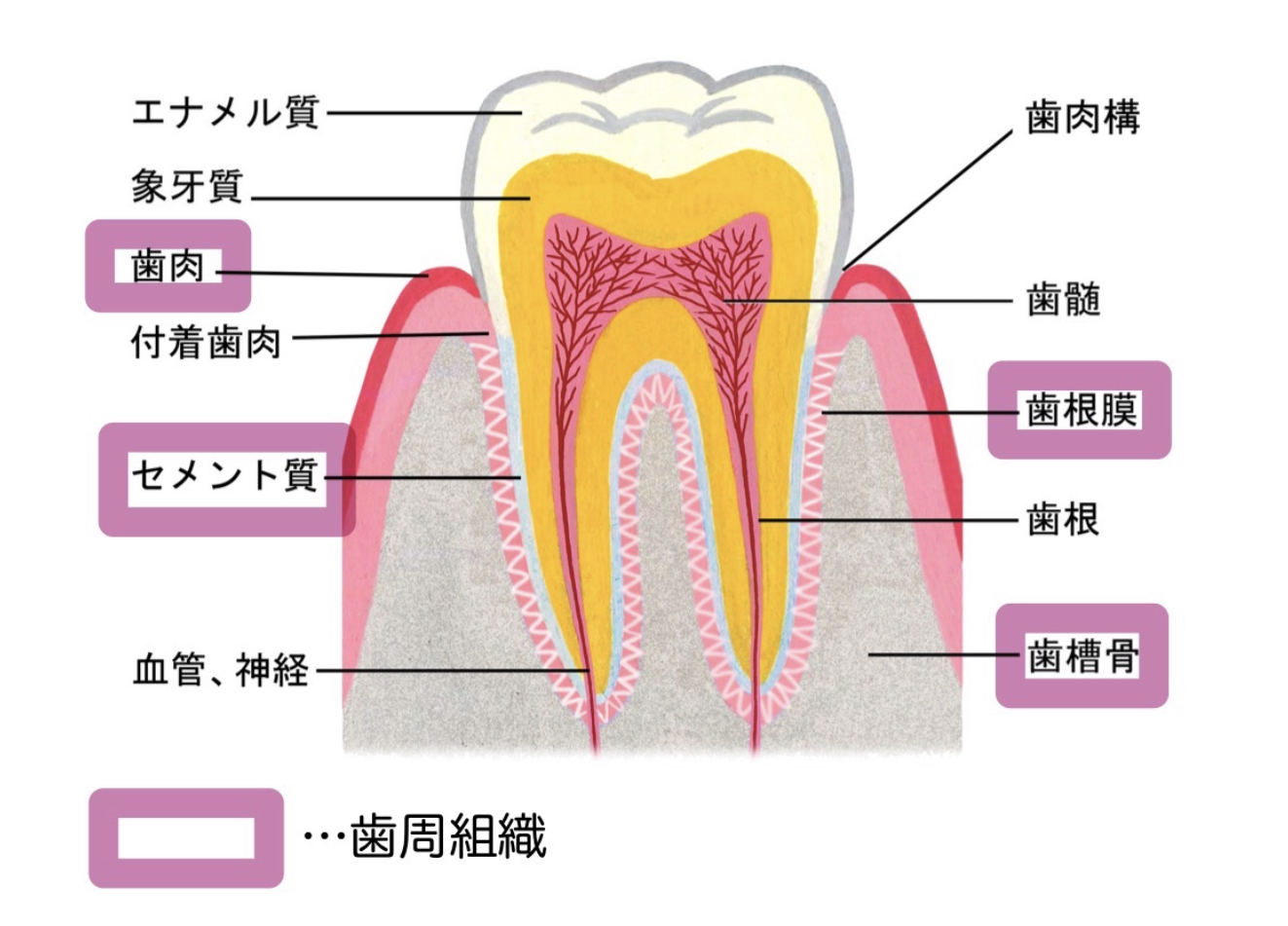 歯は、歯周組織(セメント質・歯槽骨・歯肉・歯根膜)によって支えられています。