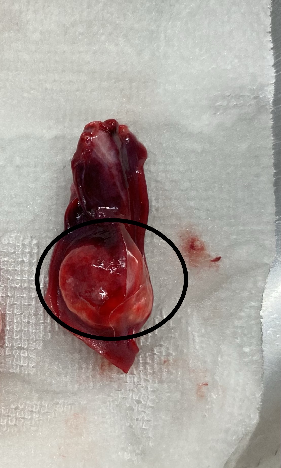 比較的体が大きな犬では『胸腔鏡』を用いた侵襲度の低い手術も実施可能ですが、今回は身体がそこまで大きくはないという事で、安全性を考慮して開胸による手術を実施いたしました。手術は大きな出血もなく終わり、無事腫瘤が存在した肺ごと摘出が完了しました。