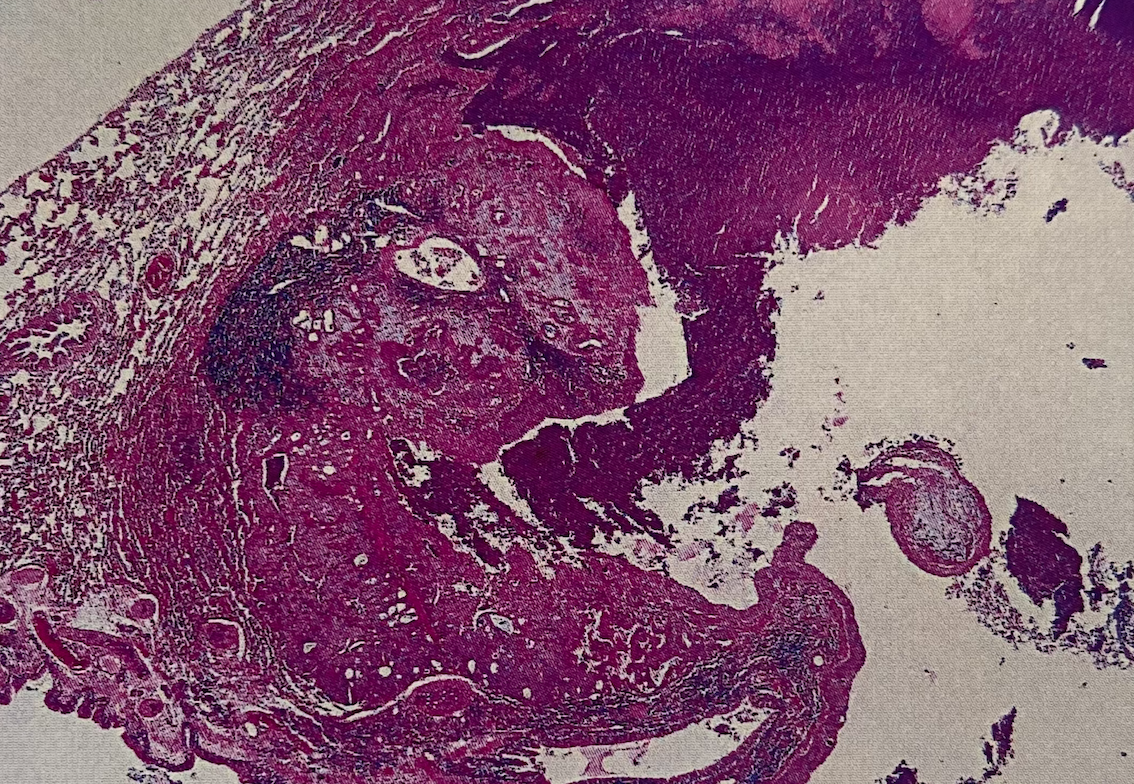 肺の腺癌で摘出状態は良好でした。転移を示唆する腫瘍細胞の脈管内浸潤もありませんでした。