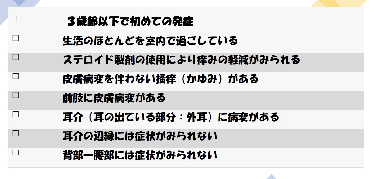 主に3 歳齢以下で初めて発症するとされており、下記に示します診断項目に5項目以上当てはまる場合は 85%がアトピー性皮膚炎であることが疑われます。