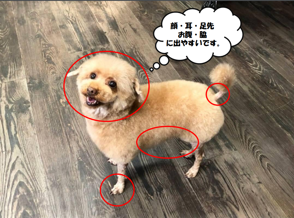 症状としては、痒みとともに紅斑(赤み)や丘疹(小さなブツブツ)、患部を舐める等がみられます。症状の出やすい部位として顔面・耳介の内部・下腹部・腋窩部・尾根部・足先の 屈曲部にみられます。