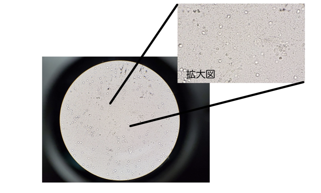 写真は細菌性膀胱炎と診断された子の尿沈渣の顕微鏡所見です。尿中に細菌が多く存在します。