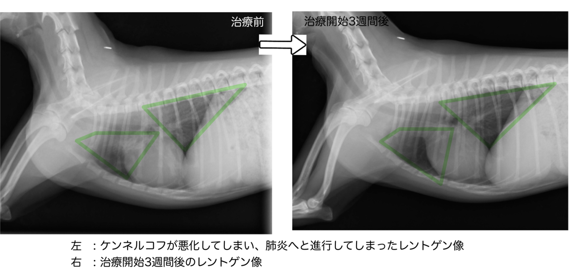 軽症である場合、胸部レントゲン検査・血液検査などで異常が見つからないことも多く、飼育環境(どこからわんちゃんを迎え入れたか・わんちゃんが沢山いる場所かなど)や臨床症状などもあわせて判断します。